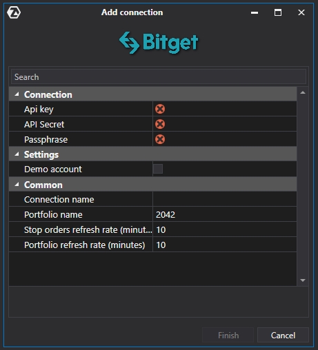 1) 在连接窗口中输入您在 Bitget 官网个人账户 中生成的 API Key 和 Secret Key。