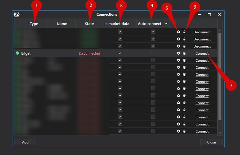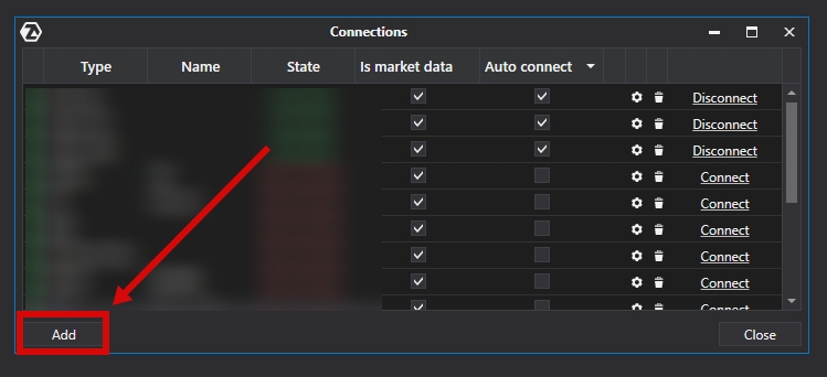 在 ATAS 平台主窗口中打开菜单,左键点击 Connections(连接)。