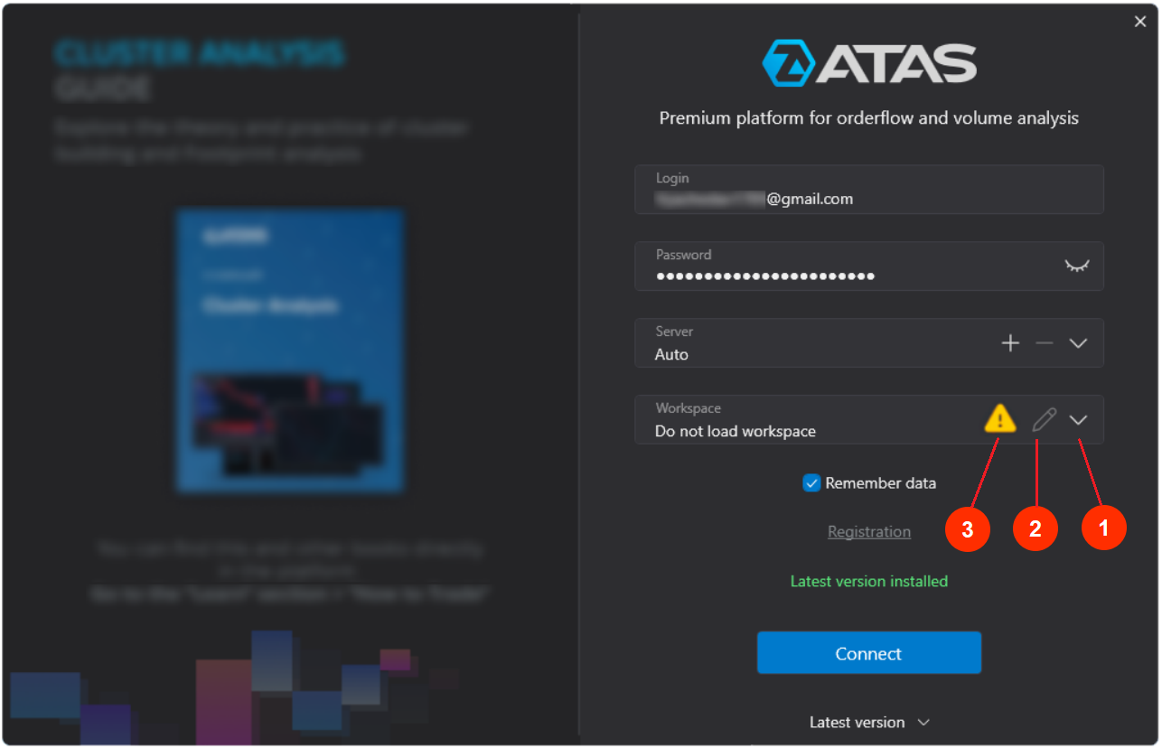 Ein gelbes Warndreieck [3] erscheint, wenn der Arbeitsbereich überlastet ist, z. B. bei zu vielen Diagrammen, Zeichenobjekten oder einer zu großen Menge an historischen Daten. Dies könnte zu einer Verlangsamung der Plattform führen. Sie können Ihren Arbeitsbereich direkt vom Anmeldefenster aus optimieren (z. B. indem Sie einige Charts entfernen oder die Anzahl der geladenen Tage reduzieren), ohne die Plattform vollständig starten zu müssen.
