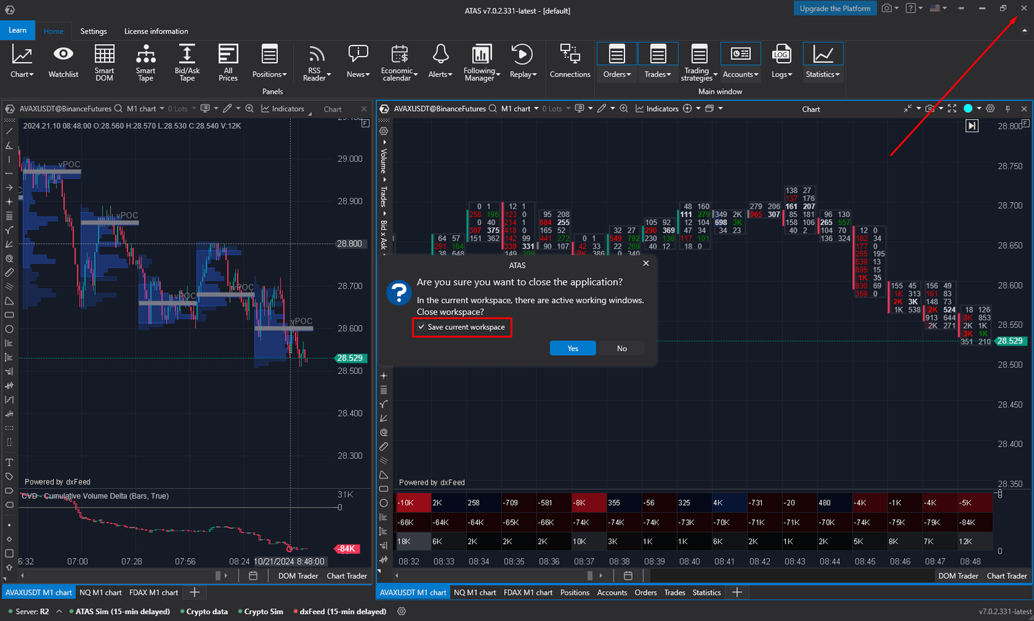 Sobald Sie den von uns vorbereiteten Arbeitsbereich angepasst oder einen neuen, auf Ihre Bedürfnisse zugeschnittenen Arbeitsbereich erstellt haben, können Sie ihn beim Verlassen der Plattform speichern. Klicken Sie einfach auf die Schaltfläche „Schließen“ in der oberen rechten Ecke der Plattform und aktivieren Sie das Kontrollkästchen, um die Speicherung zu bestätigen.
