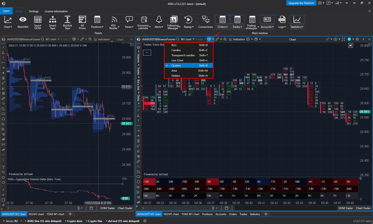Dadurch erhalten Sie ein Setup mit zwei duplizierten Fenstern auf der linken und rechten Seite des Bildschirms. Im Dropdown-Menü des rechten Charts können Sie nun von Candlesticks zu Clustern wechseln und den Fußabdruck an Ihre bevorzugte Ansicht anpassen.