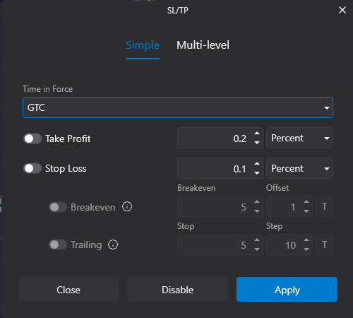 Einfach. Dadurch können Sie automatisch Take-Profit- und Stop-Loss-Orders in einem bestimmten Bereich ab dem Einstiegspreis festlegen. Sie können auch einen Trailing Stop festlegen oder die Gewinnschwelle anpassen (nachdem Sie die Strategie konfiguriert haben, klicken Sie unbedingt auf „Übernehmen“).