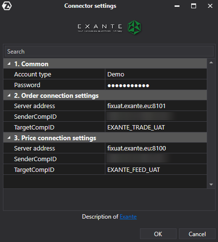 2. Geben Sie im Fenster "Einstellungen" alle Parameter für die Einrichtung einer festen Verbindung zu Ihrem Exante-Konto ein, wie sie vom Broker bereitgestellt werden.
