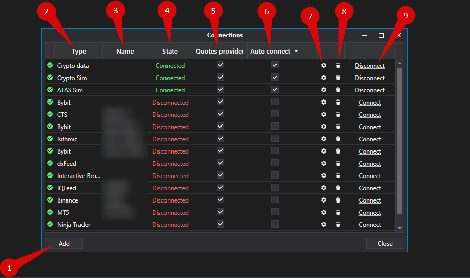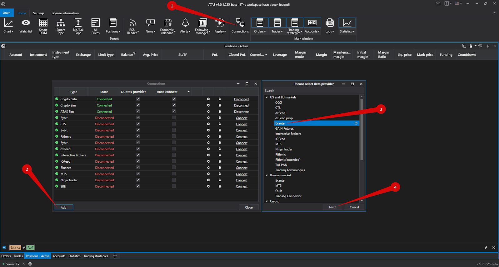1. Um die Exante-Verbindung zur ATAS-Plattform zu konfigurieren, rufen Sie das Menü des Hauptfensters der ATAS-Plattform auf und klicken mit der linken Maustaste auf den Punkt Verbindungen im Hauptfenster der Plattform.