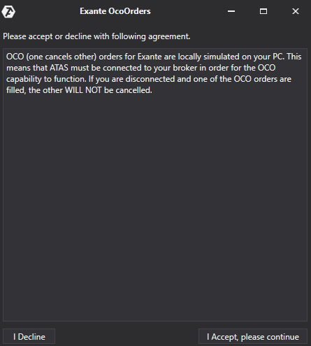 OCO-Aufträge (one cancels other) für die Exante-Verbindung werden lokal auf Ihrem Computer emuliert. Das bedeutet, dass die Plattform mit Ihrem Broker verbunden sein muss, damit die OCO-Aufträge richtig funktionieren. Wenn Sie nicht verbunden sind und eine OCO-Order ausgeführt wird, werden die anderen Orders der gleichen Gruppe NICHT STORNIERT!