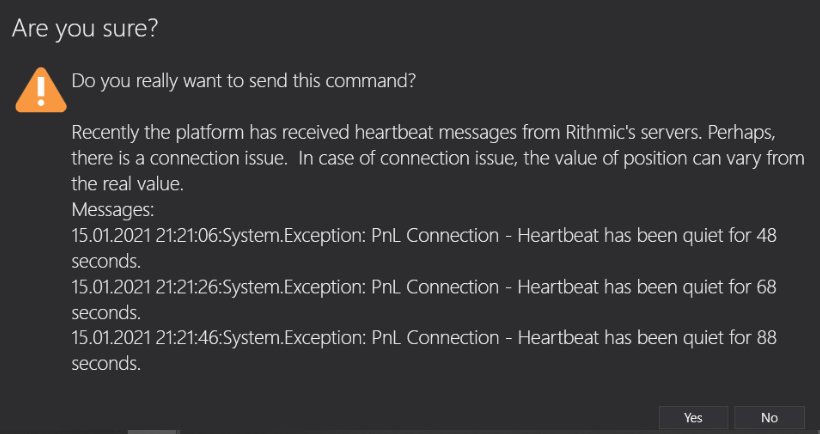 ✔ Möglicher Verbindungsverlust. Dies ist eine Art Zwischenzustand zwischen verbundener und unterbrochener Verbindung. In solchen Momenten sendet Rithmic Meldungen wie: 'PnL Connection - Heartbeat has been quiet for XX seconds' . Anstelle einer PnL-Verbindung kann es auch eine Trading Connection, eine History Connection usw. geben. Diese Meldungen zeigen an, dass für eine bestimmte Anzahl von Sekunden kein Datenaustausch mit der entsprechenden Rithmic-Verbindung (PnL, Trading, Historical, etc.) stattgefunden hat. Für einen Trader kann dies Folgendes bedeuten:
