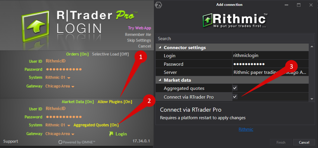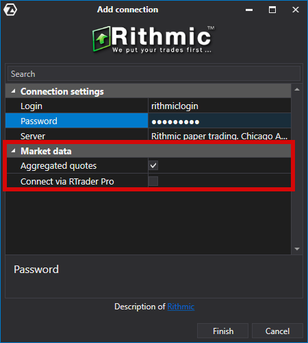 Aktivieren Sie in den Einstellungen des Rithmic Connectors in ATAS die Kästchen neben Aggregierte Zitate und Connect via RTrader Pro