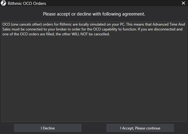 OCO-Aufträge (One Cancels Other) zur Verbindung werden lokal auf Ihrem Computer simuliert. Das bedeutet, dass die Plattform mit Ihrem Broker verbunden sein muss, damit die OCO-Aufträge richtig funktionieren. Wenn die Verbindung unterbrochen wird und einer der OCO-Aufträge ausgeführt wird, werden die anderen Aufträge in der Gruppe NICHT storniert! Wenn Sie damit einverstanden sind, klicken Sie auf Ich akzeptiere, bitte fahren Sie fort.