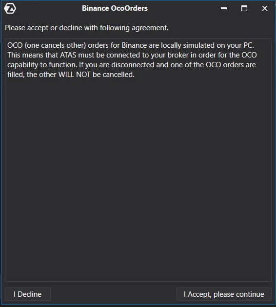 OCO (one cancels other) Orders zum Anschluss an Binance werden lokal auf Ihrem Computer emuliert. Das bedeutet, dass die Plattform mit Ihrem Broker verbunden sein muss, damit die OCO-Orders ordnungsgemäß funktionieren. Wenn Ihre Verbindung unterbrochen wird und einer der OCO-Orders ausgeführt wird, werden die anderen Orders dieser Gruppe NICHT storniert!