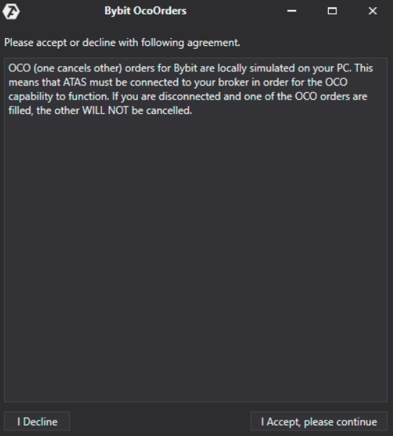 OCO (one cancels other) zur Verbindung mit Bybit werden lokal auf Ihrem Computer emuliert. Das bedeutet, dass die Plattform mit Ihrem Broker verbunden sein muss, damit die OCO-Orders richtig funktionieren. Wenn Sie nicht verbunden sind und eine der OCO-Orders ausgeführt wird, werden die anderen Orders dieser Gruppe NICHT storniert!