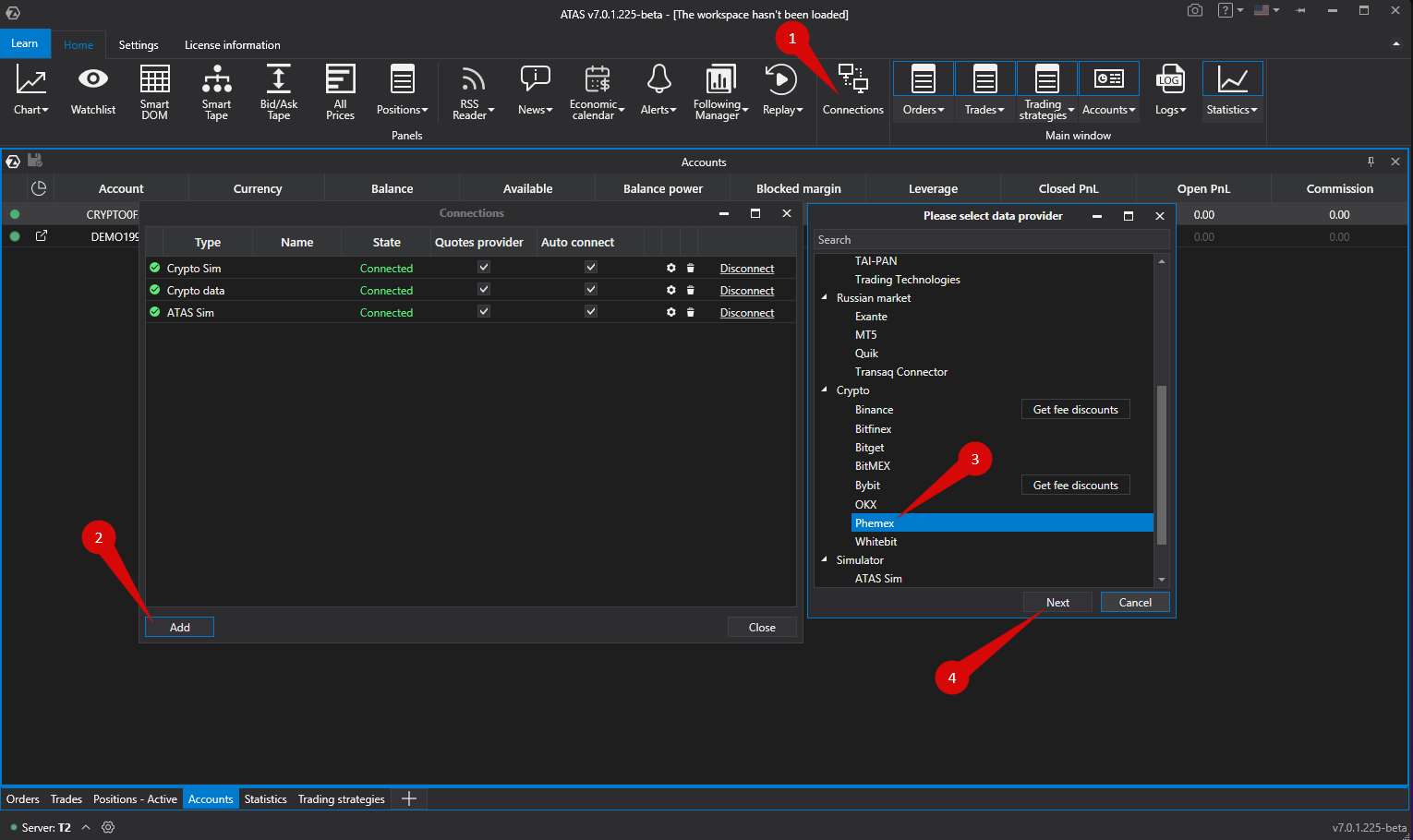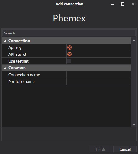Im folgenden Dialogfeld wählen Sie den Verbindungstyp Phemex aus und klicken auf Weiter.
