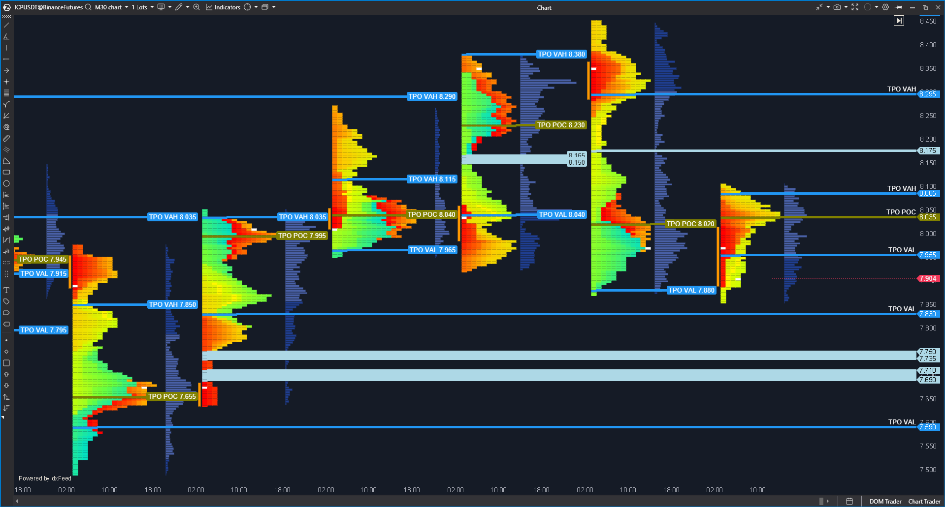 Der Chart wird mit dem TPO- und dem Profil-Indikator erstellt und bietet flexible Visualisierungsoptionen, wie z. B. die Anzeige zusätzlicher Niveaus, die Erweiterung der Niveaus, um sie mit dem Preis zu schneiden, die Aufteilung des TPO-Charts in Unterperioden und vieles mehr.
