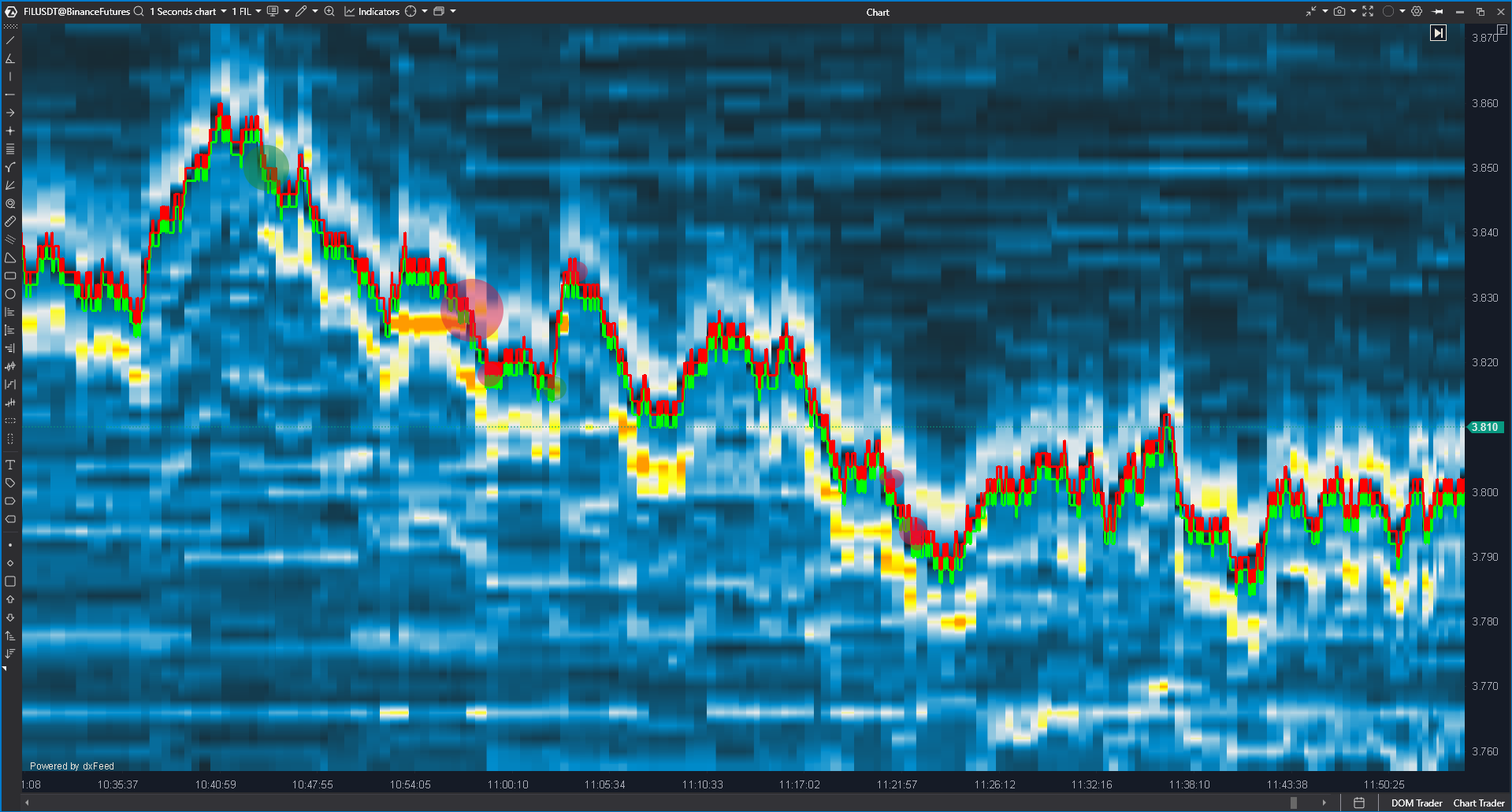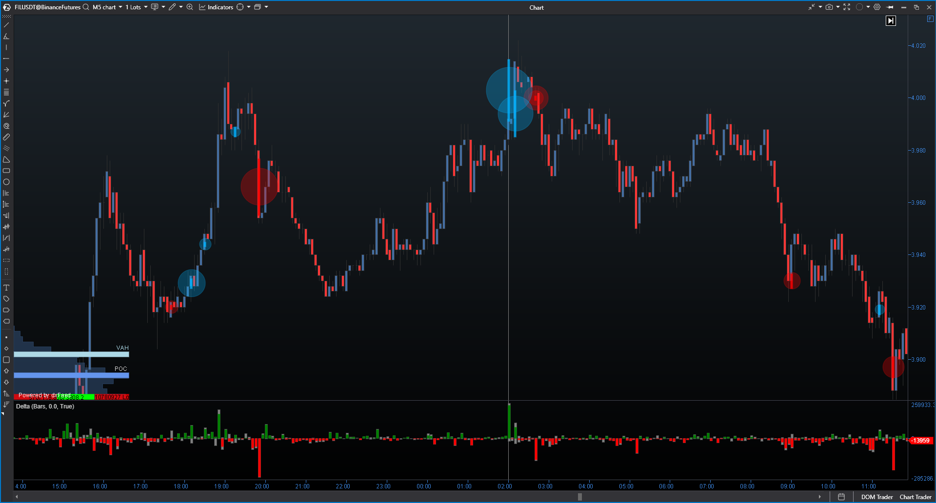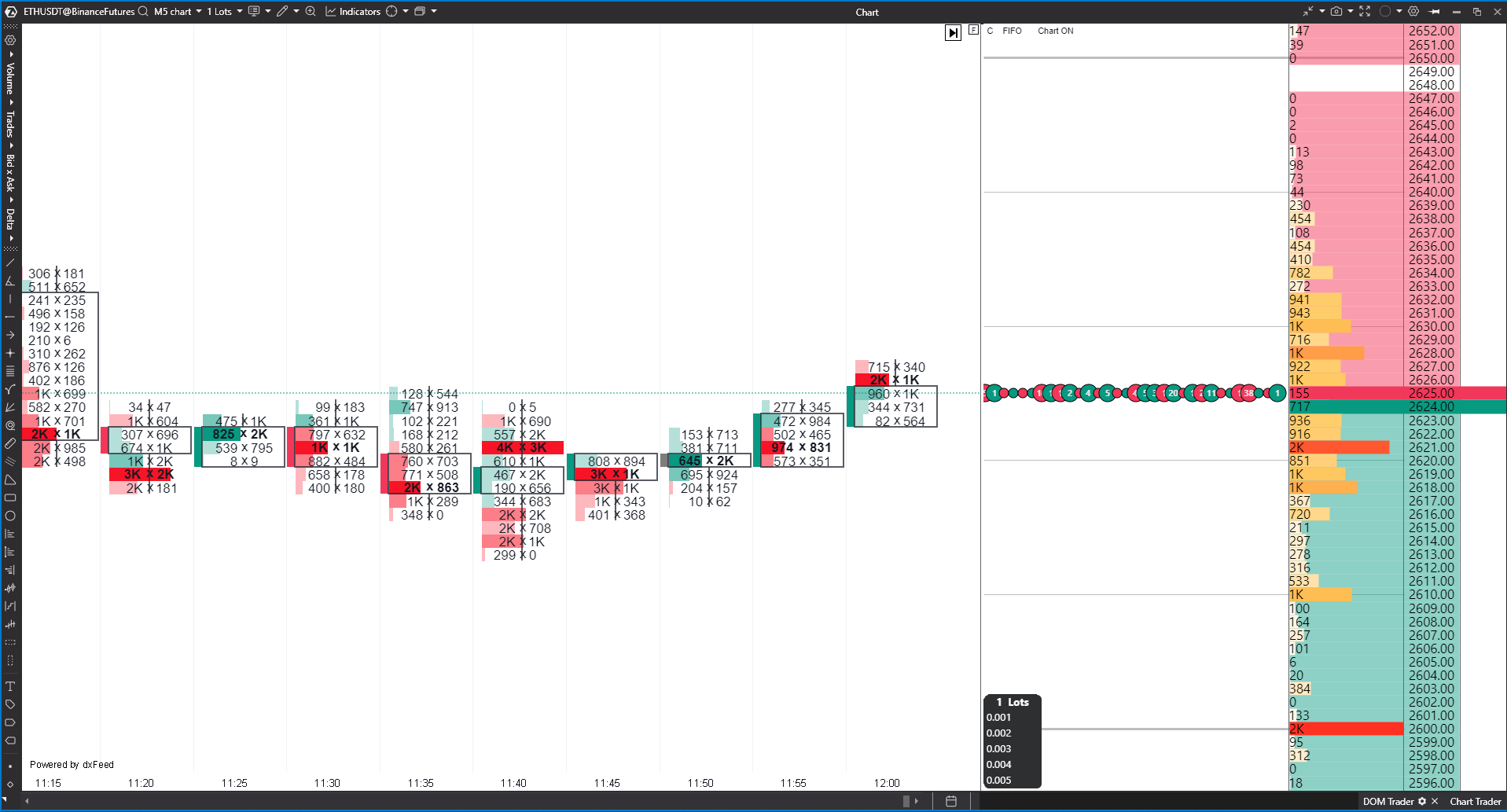 Diese multifunktionale Vorlage hilft Ihnen bei der Analyse der Limit-Order-Aktivität im Orderbuch und im Orderflow. Der Indikator DOM Levels ermöglicht es Ihnen, Veränderungen im Orderbuch zu verfolgen, gefälschte Levels mit großen Volumina zu erkennen, die gelöscht wurden, als sich der Preis näherte, und echte Levels zu identifizieren, die entweder von gegnerischen Trades absorbiert wurden oder dem Druck widerstanden, was zu einer Preisumkehr führte. Die Vorlage wird mit Ein-Sekunden-Kerzen erstellt.