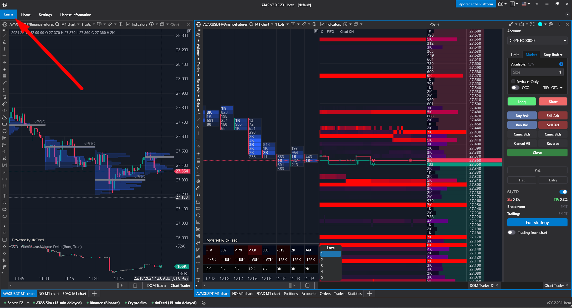 - Analysieren Sie Cluster zusammen mit dem Smart Tape und dem DOM-Volumen - Gehen Sie schnell in Positionen ein und aus, platzieren und stornieren Sie Aufträge mit einem Klick und passen Sie das Handelsvolumen mit Hotkeys an