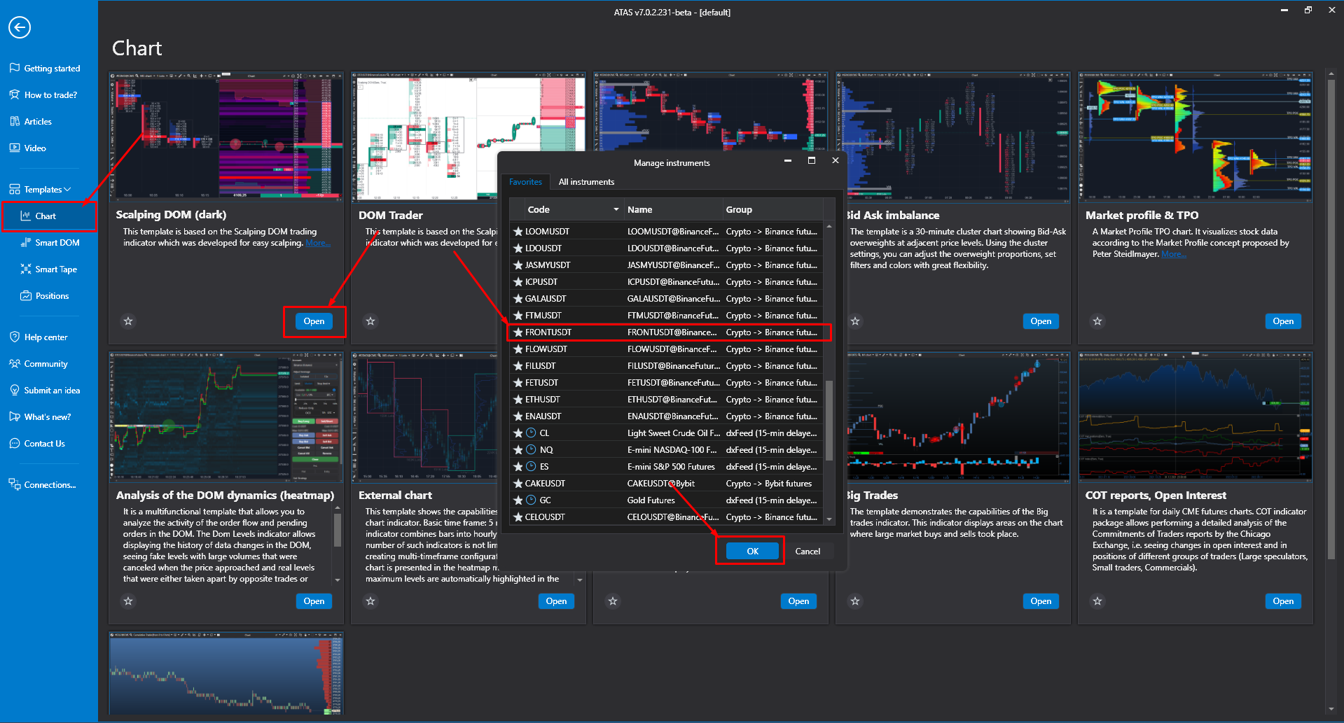Öffnen Sie dazu die Registerkarte „Vorlagen“, wählen Sie die Kategorie „Chart“, wählen Sie die gewünschte Vorlage und klicken Sie auf „Öffnen“. Wählen Sie dann das gewünschte Instrument aus und klicken Sie auf „OK“.