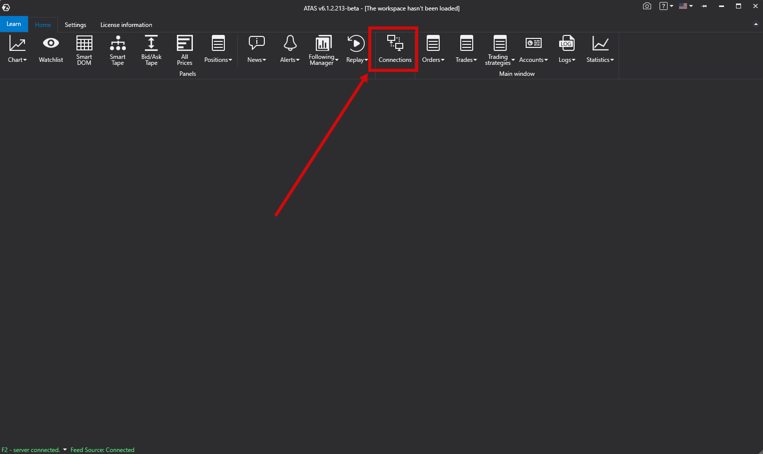 Vaya al menú de la ventana principal de la **plataforma ATAS** y haga clic con el botón izquierdo del ratón en **Conexiones / Connections** en la ventana principal de la plataforma.