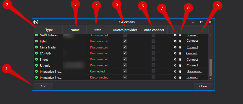 . Añadir - añadir una nueva conexión. 2. Tipo - la fuente de la conexión. 3. Nombre - el nombre de la conexión, que puede establecer usted mismo. 4. Estado - el estado de la conexión. 5. Proveedor de cotizaciones - opción para seleccionar un proveedor de cotizaciones (esta conexión se utilizará como proveedor de cotizaciones). 6. Autoconexión - si desea que la conexión se produzca automáticamente al iniciar la plataforma, debe activar esta opción. 7. Botón de configuración de la conexión. 8. Botón de eliminación de la conexión de la lista. 9. Conexión/desconexión - conectar/desconectar el conector.