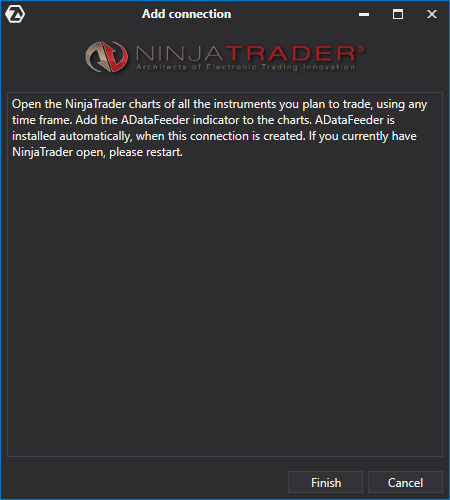 Para conectar Ninja Trader, se deben cumplir las siguientes condiciones: 1. Versión de NinjaTrader 8.1.1.7 o superior 2. Versión ATAS Latest 6.0.4.316 o superior o Beta 6.0.4.216 o superior 3. La plataforma NinjaTrader debe estar funcionando con la cuenta y las cotizaciones conectadas 4. El indicador ADataFeeder es añadido a un solo gráfico en NinjaTrader, la ventana debe estar abierta y expandida 5. Para que ADataFeeder funcione correctamente, la hora del sistema en su ordenador debe estar sincronizada con la hora mundial y coincidir con la hora en NinjaTrader