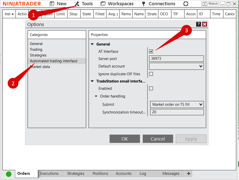 1. En la plataforma Ninja Trader ir a Tools - Automated trading interface - activar AT Interface