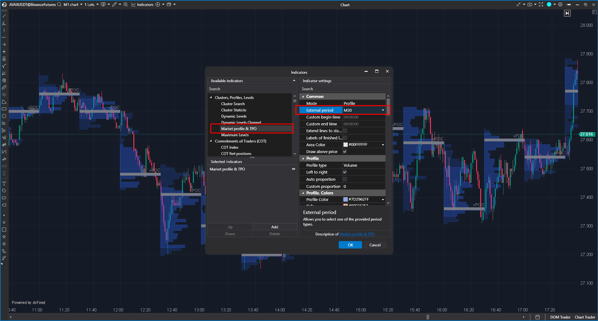 En la plataforma ATAS existen varias opciones para visualizar el perfil de volumen. Vamos a considerar la opción de añadir el indicador Market Profile & TPO, que muestra el perfil de volumen para el período seleccionado en la configuración (en este caso consideramos la moneda AVAXUSDT en el gráfico M1, y el período para el perfil de volumen es de 30 minutos).