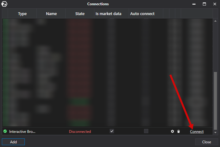 In the opened window, choose Add and in the next window choose Interactive Brokers and press Next.