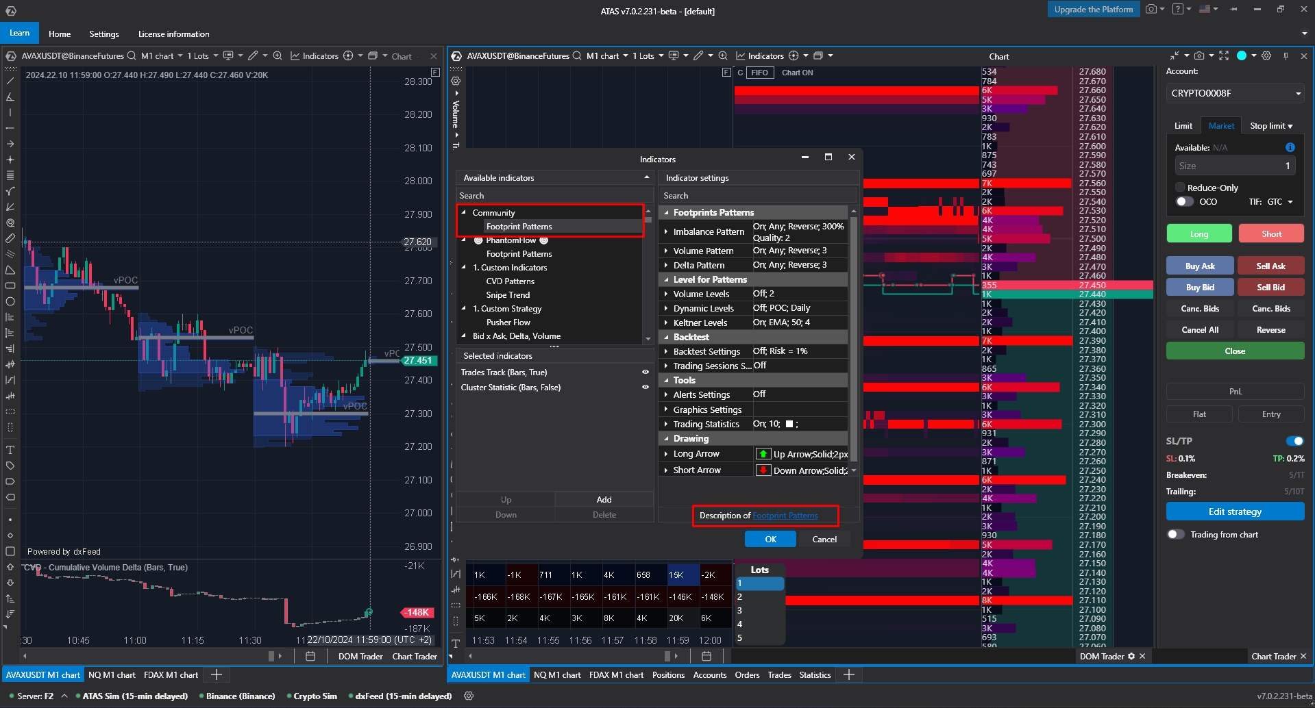 La plateforme ATAS permet aux utilisateurs de créer et de partager des indicateurs uniques et des bots de trading avec d'autres traders. Vous pouvez trouver ces outils dans la fenêtre des indicateurs, sous la catégorie « Communauté ». Si vous êtes intéressé par des stratégies de trading basées sur les modèles en clusters et les niveaux, envisagez d'ajouter l'indicateur FootprintPatterns. Il propose des paramètres flexibles pour faciliter votre analyse du marché. Un guide d'utilisation est disponible dans la description de l'indicateur.