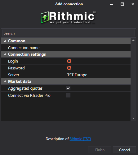 Per connettere l'account, fare clic sul pulsante Connections nella finestra principale della piattaforma, quindi fare clic su Add, e nella finestra successiva, selezionare Rithmic (TST).