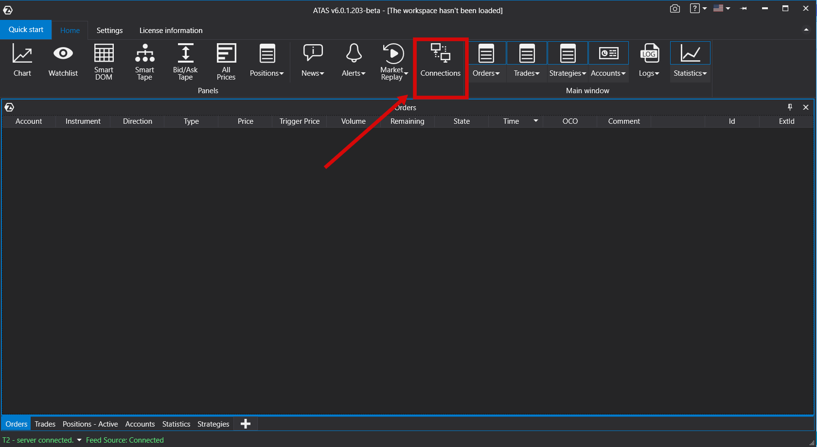 Go to the menu of the **ATAS platform’s** main window and left-click **Connections** there.