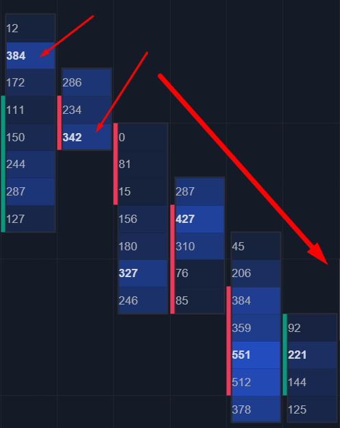 strong buyer candle – the highest volume is located in the body or lower wick of the candle (if the price closes above the highest volume, it indicates that the buyer has achieved their goal for the moment and is currently in profit);