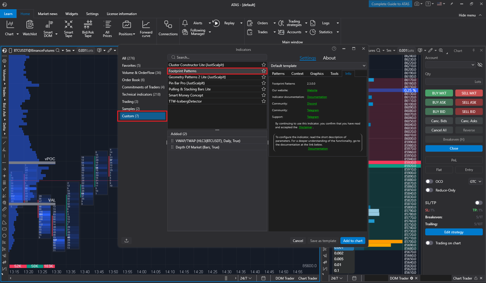 The ATAS platform enables users to create and share unique indicators and trading bots with other traders. You can find these tools in the Indicators window under the "Custom" category. If you are interested in trading strategies based on cluster patterns and levels, consider adding the FootprintPatterns indicator. It offers flexible settings to make your market analysis easier. A user guide is available in the indicator’s description.